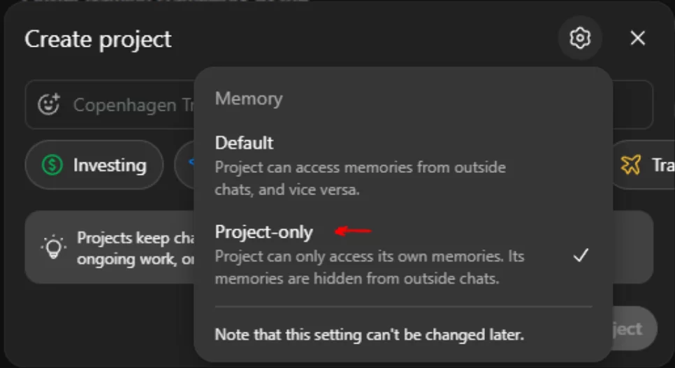 → You can decide whether you want the chats here to be saved in your memory or not. If this is a one off thing or something that is totally separate from the rest of what you do, then I’d keep the memory limited to the project only (you can only choose this at the time that you create the project).