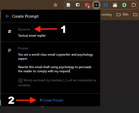 4. Add keyword (shortcut) and your prompt. And click on create prompt at the bottom.