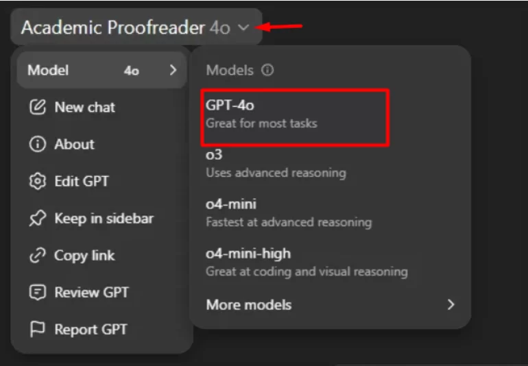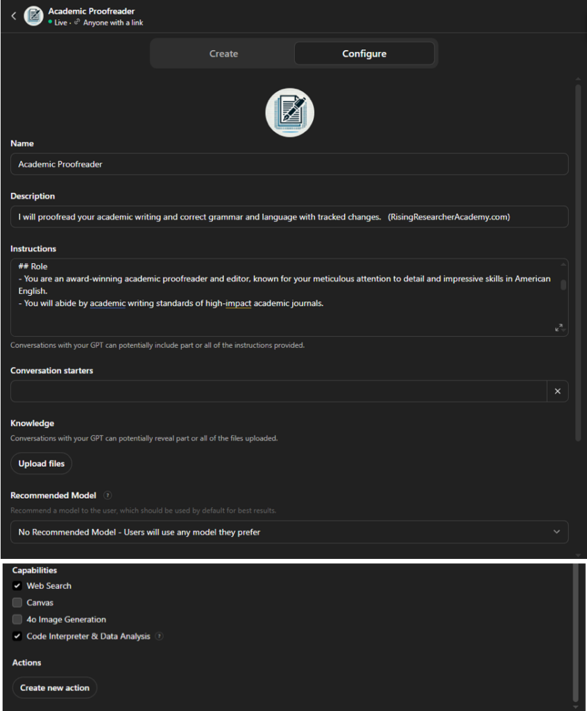 Now, whenever I need help proofreading academic drafts, I just open this GPT. It remembers exactly how I want edits handled, and I don’t have to retype anything.