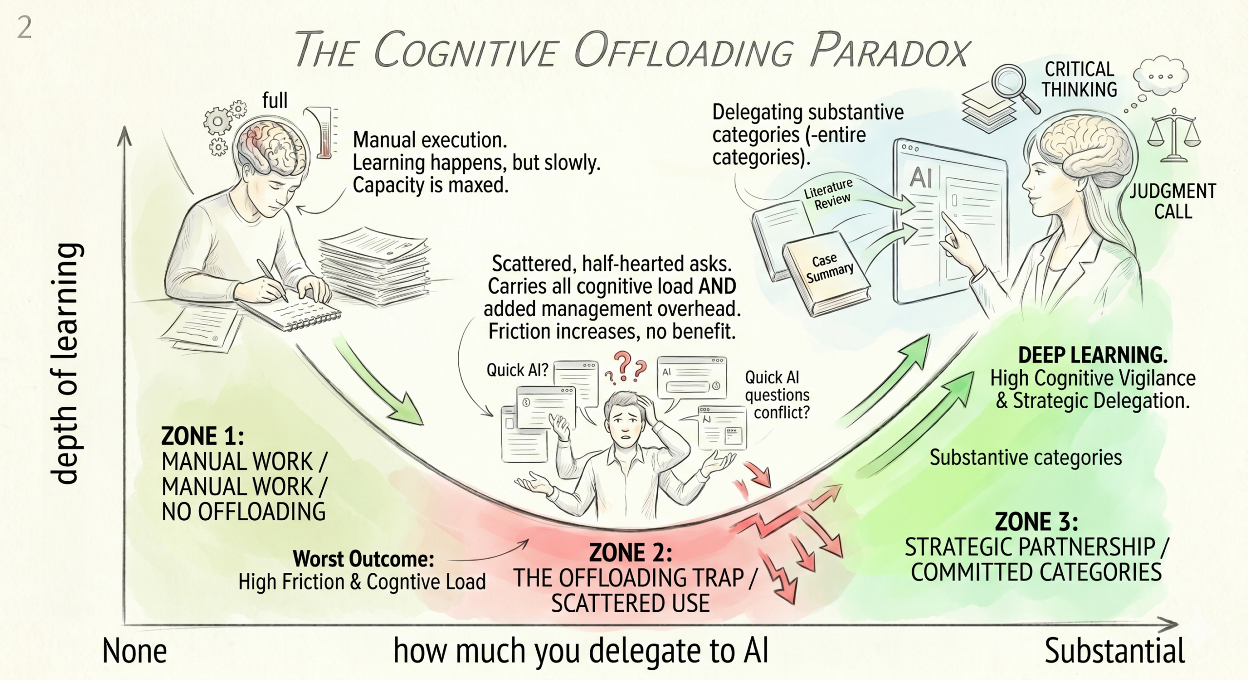 🟢 Zone 1: No offloading. You do everything manually. Learning happens but slowly. Your cognitive capacity is maxed out on execution. Nothing left over for higher-order reflection.