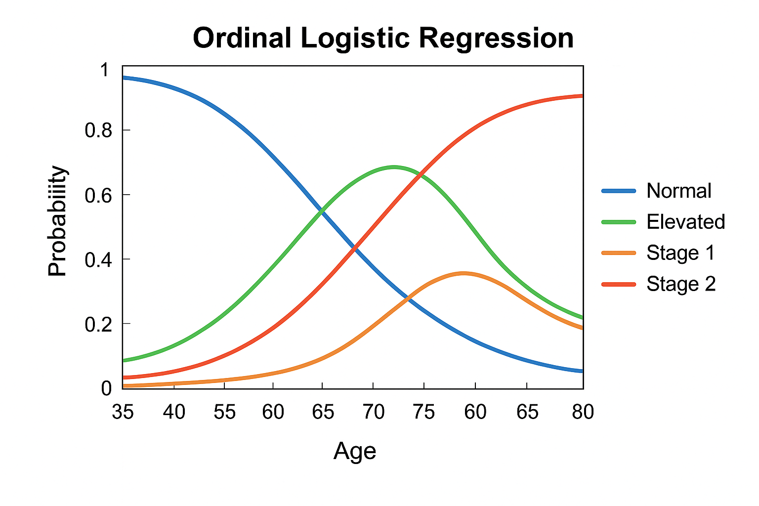 Ordinal logistic regression figure showing how the probability of each BP category (Normal, Elevated, Stage 1, Stage 2) changes with Age.