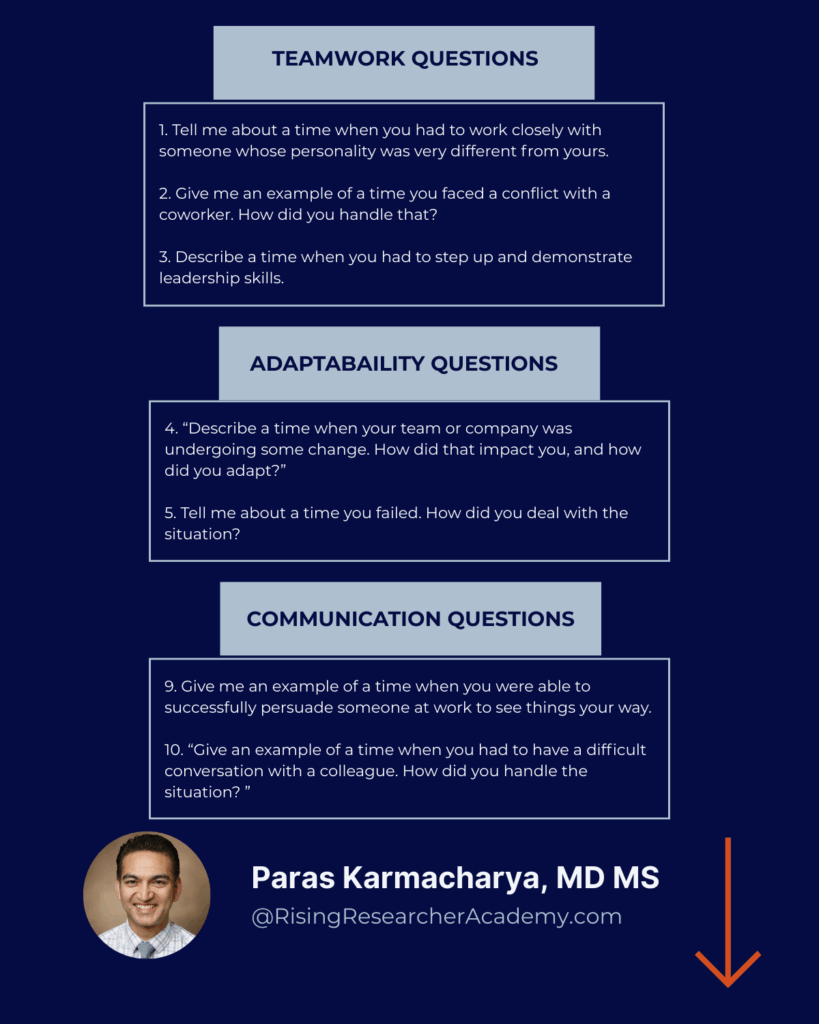 Have 10–15 examples ready. Cover teamwork, adaptability, leadership, failure, time management, and communication. You’ll reuse the same stories—just framed differently.