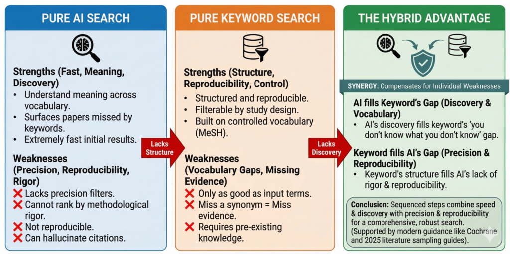 AI’s strength (vocabulary discovery, conceptual bridging) fills keyword search’s gap (you don’t know what you don’t know). Keyword search’s strength (precision, reproducibility, structured filtering) fills AI’s gap (relevance ranking without rigor assessment, non-reproducible results).