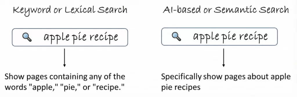 AI or semantic search engines process words and phrases according to their meaning rather than the literal text. So “heart attack,” “AMI,” and “myocardial infarction” all get recognized as related concepts. Traditional keyword-based engines like PubMed require exact matches in indexed fields such as title, abstract, author list, keywords, and MeSH terms.
