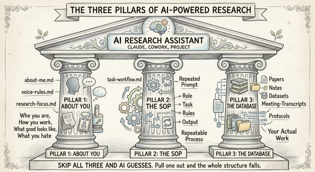 Pillar 3: The Database. Every paper, note, dataset summary, meeting transcript, and protocol that AI needs to ground itself in your actual work.